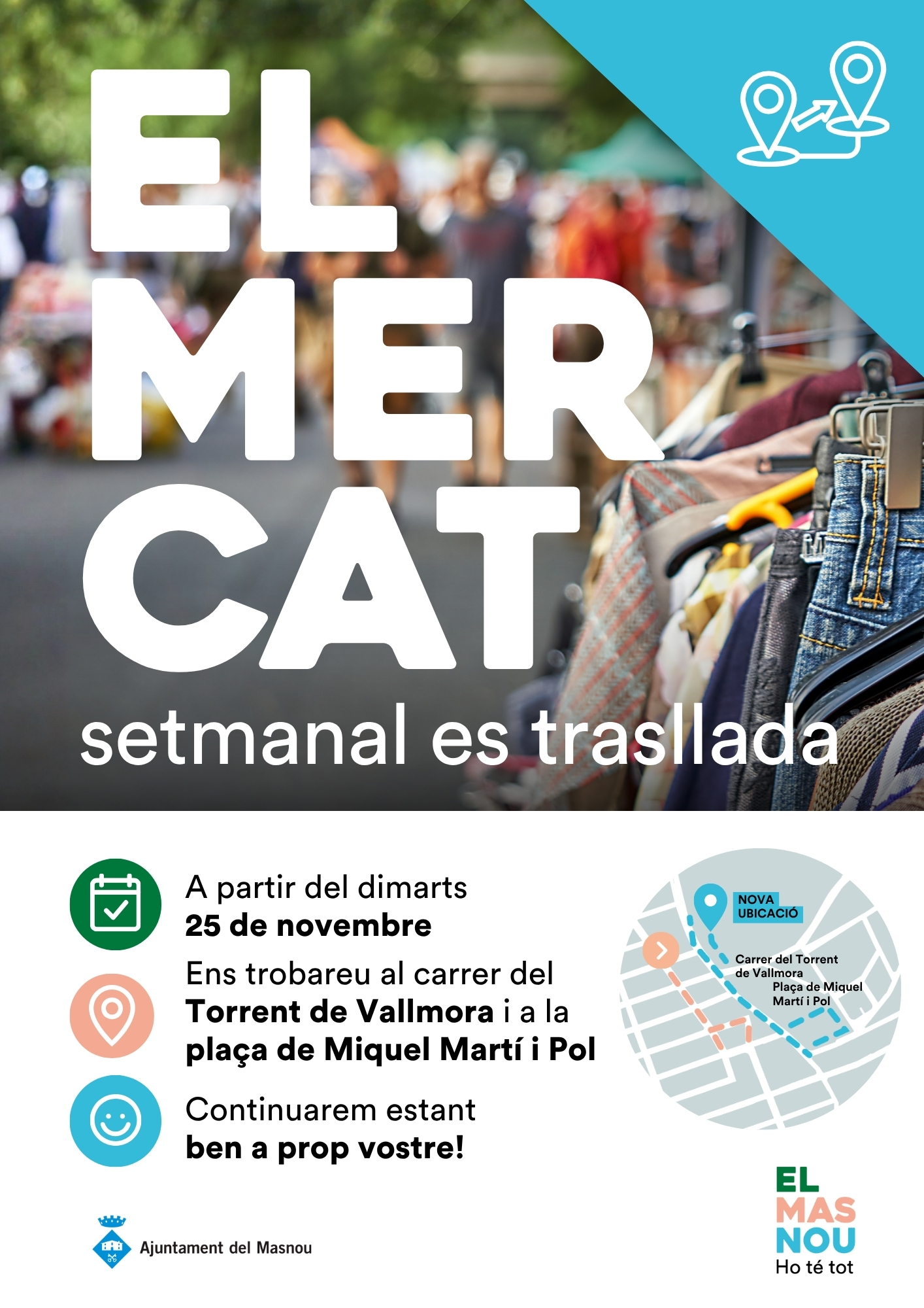 El mercat setmanal es continua fent els dimarts laborables, però a partir del 25 de novembre, s'instal·la a la plaça de Miquel Martí i Pol i el carrer del Torrent de Vallmora, fins al parc de Vallmora.