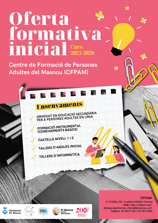 Per concertar una altra hora cal demanar cita prèvia per correu electrònic a cfpam@elmasnou.cat o trucant per telèfon als números 93 557 17 60 / 93 557 18 82 .