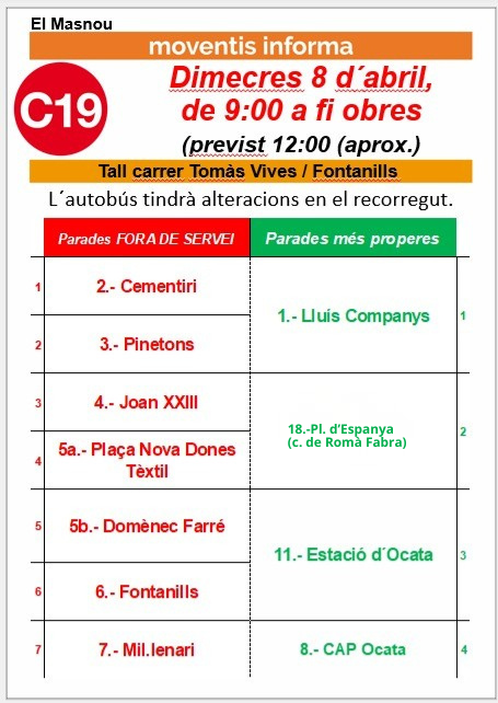 Es desvia l’autobús del bus urbà del Masnou (línia C19), a causa d’un esvoranc que ha aparegut al carrer de Tomàs Vives, entre els carrers de Joan Miró i de Fontanills.