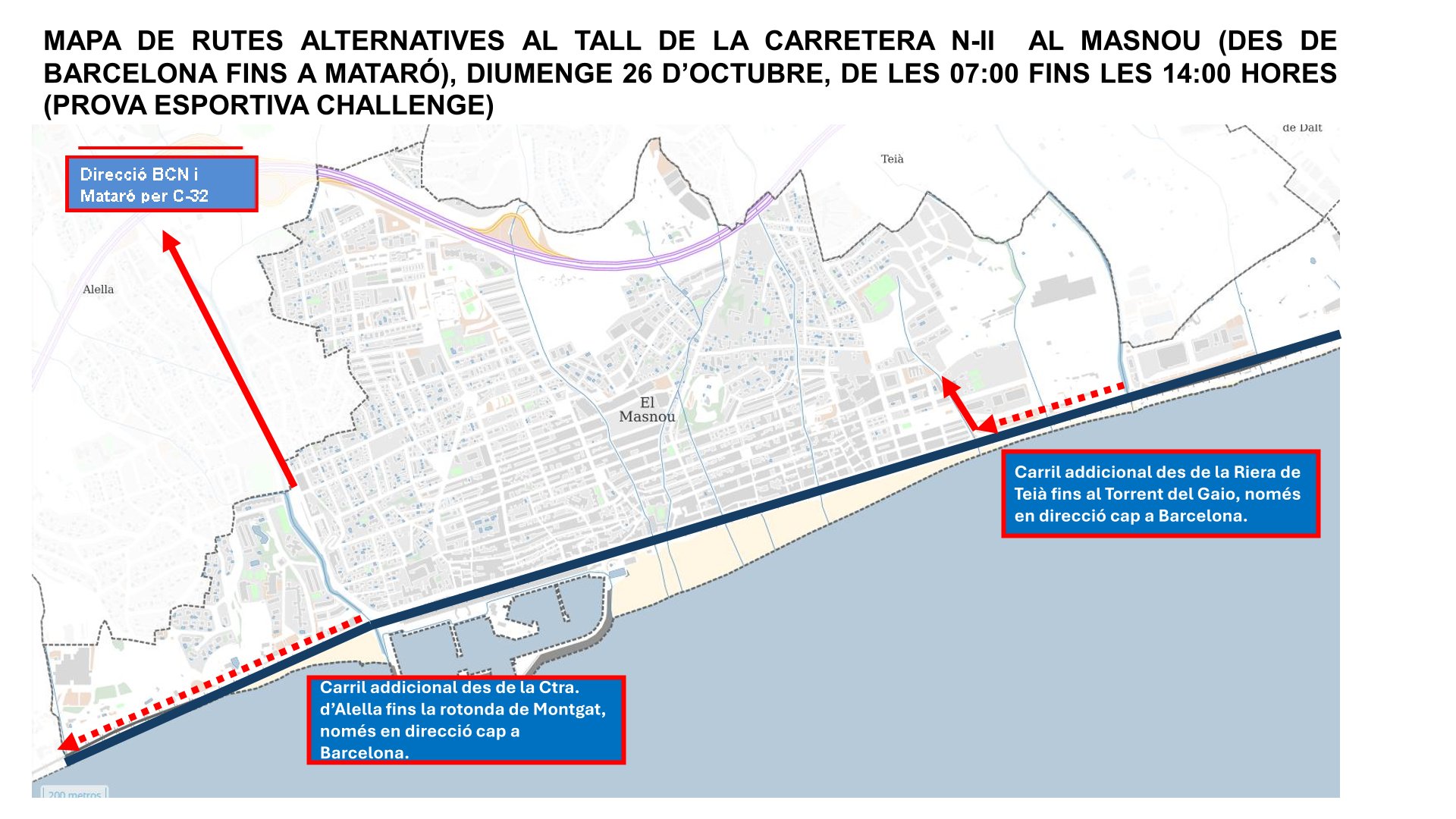 La carretera N-II romandrà tallada al trànsit de vehicles el matí del diumenge 26 d'octubre, entre Barcelona i Mataró, per la celebració de la prova esportiva Challenge Barcelona Triatló.