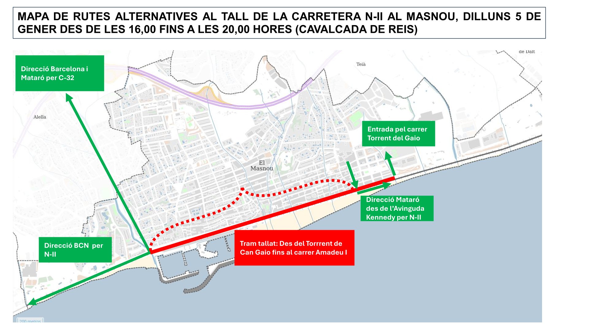 Els Reis d’Orient arribaran en vaixell, al port del Masnou, a les 17.30 h del 5 de gener. Pels volts de les 18 h, començarà la gran Cavalcada, a l’N-II, davant de l’estació del Masnou. El recorregut serà una mica més curt que en els darrers anys, però acabarà, com sempre, a la plaça de Ramón y Cajal, al Masnou Alt, on Ses Majestats saludaran tots els nens i les nenes que hi vagin i els carters i patges reials recolliran les cartes que encara no s’hagin lliurat.