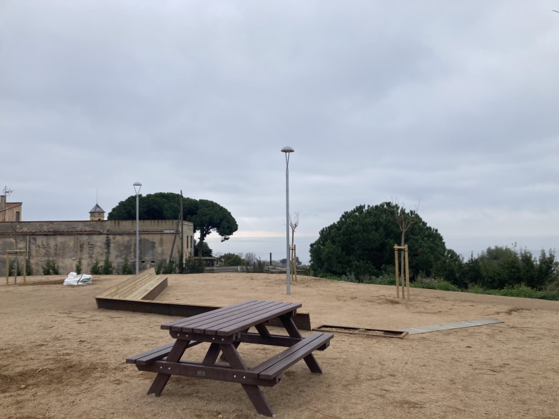 Els jardins compten amb enllumenat públic i mobiliari urbà per incentivar que el veïnat se’l faci seu. Per exemple, en una de les plataformes s’hi ha creat una zona d’esbarjo per a gossos. A més, s’han instal·lat bancs, papereres i altres elements, repartits pels diversos espais del parc. A la terrassa més gran també s’hi ha col·locat una taula de pícnic, un gronxador i un tobogan. Aquí, tots els elements s’han disposat aprofitant l’orientació, que la converteix en un mirador encarat al mar, gràcies a les vistes que proporciona l’elevació d’aquest terreny respecte als camps que voregen la riera de Teià. Amb tot, s’ha de precisar que properament s’hi instal·laran més elements de mobiliari urbà, com ara fonts d’aigua i més jocs infantils.