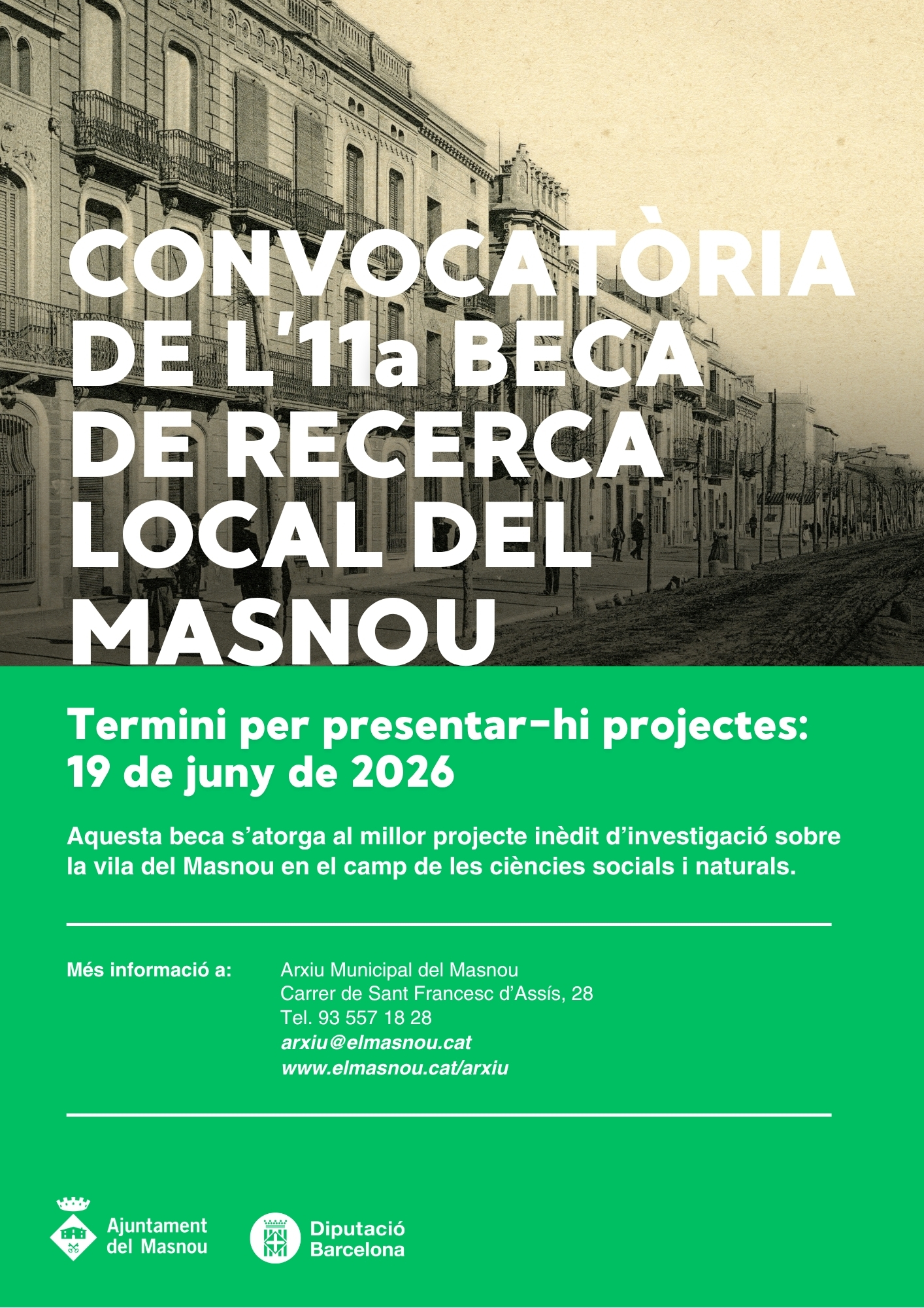 L’Ajuntament del Masnou ha obert la convocatòria de la 11a beca de recerca local del Masnou, que s’atorgarà al millor projecte inèdit d’investigació sobre la vila del Masnou en el camp de les ciències socials i naturals, i, en especial, la història i el patrimoni cultural, artístic, musical i natural de la vila.